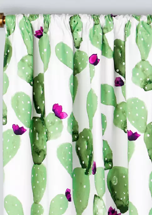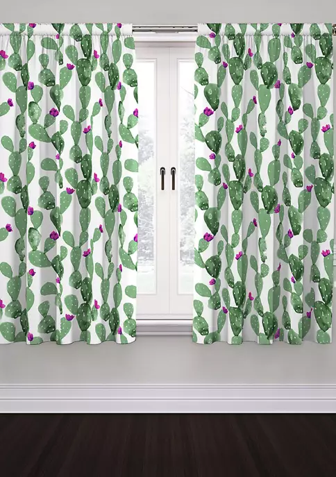 Luxuriously soft fabric features novelty green cactus and fuchsia flower print on a white ground