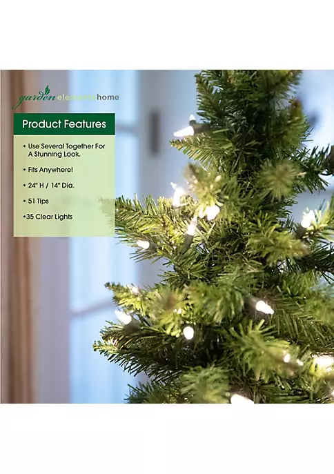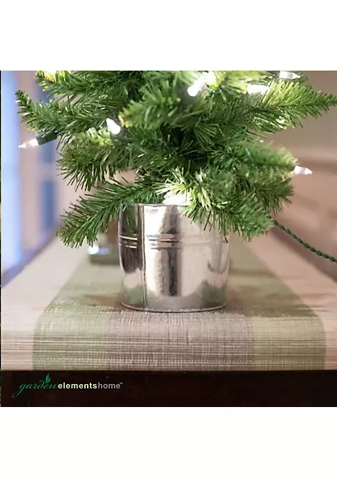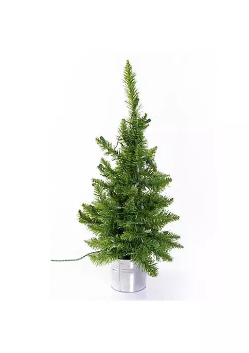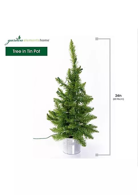 Lighted tabletop tree in tin pot, constructed to look like real metal! Perfect size, this tree can fit anywhere! The windowsill, mantel, table, or used as a centerpiece. Stands 24″ high and shines beautifully with 35 clear incandescent lights.
