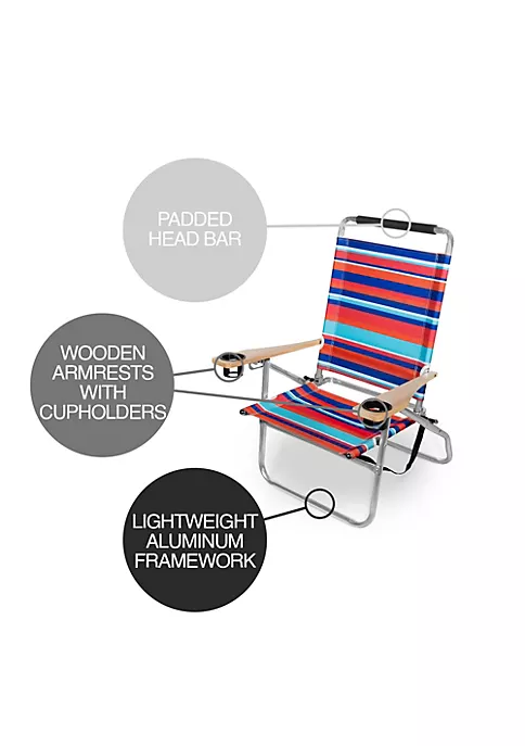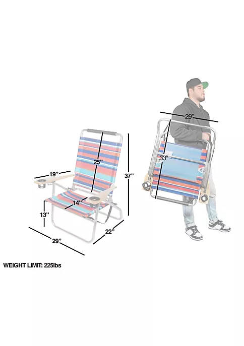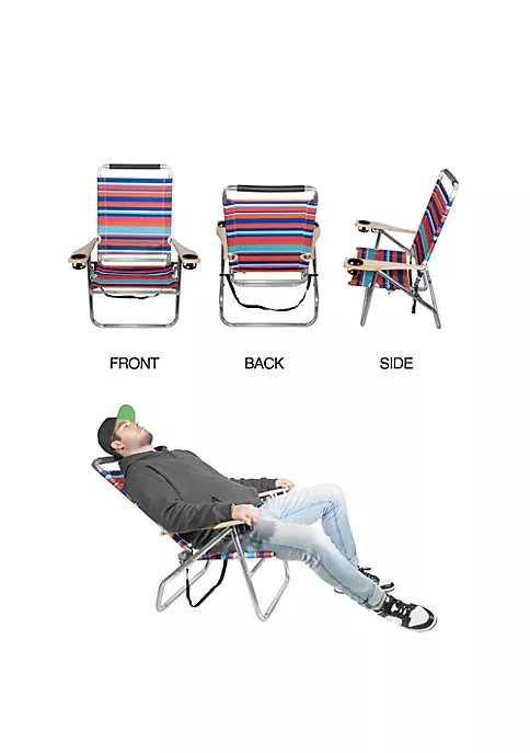 Our beach chairs with carrying straps are perfect for your trips to the beach or outdoor events! Key Product FeaturesYou will receive (2) beach chairs with your orderWhen you want to recline in this 3-position low beach chair without tipping over, simply lift the armrests and adjust while you’re seatedTo pack up the folding chair, bring the legs together for trouble-free transportThe seat fabric is fun and bright, perfect for any summer occasion 37″ x 22″ x 29″ in dimension Weight limit is 225 pounds Each reclining beach chair has 2 cup holders, which is a great place for setting down your refreshing beverage on a hot day. The aluminum frame is lightweight, as well as rust resistant, which is perfect for outdoor use