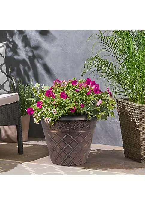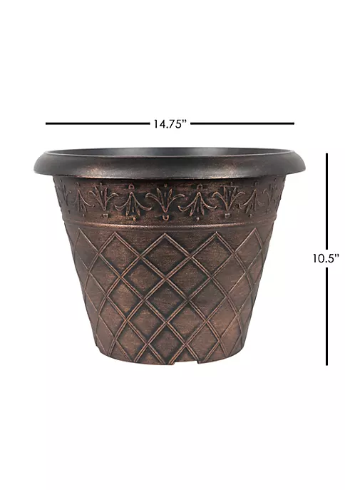 - Planter construction uses horizontal trim to join a gracefully curved planter shape with a proportionally sized rim. The simple design accentuates the plant foliage located within it.