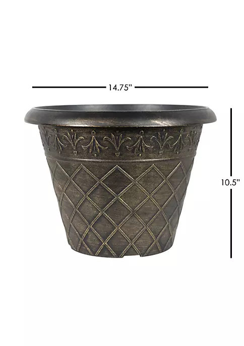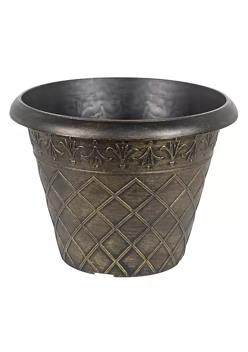 - Planter construction uses horizontal trim to join a gracefully curved planter shape with a proportionally sized rim. The simple design accentuates the plant foliage located within it.