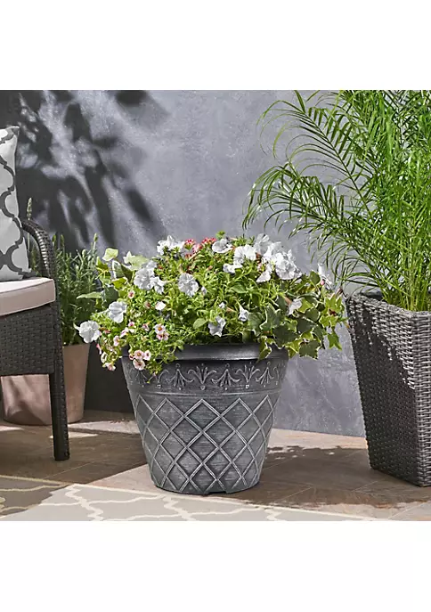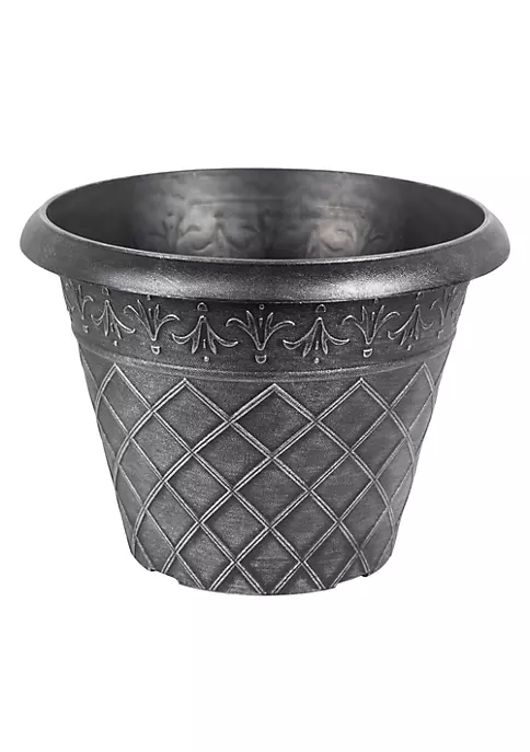 - Planter construction uses horizontal trim to join a gracefully curved planter shape with a proportionally sized rim. The simple design accentuates the plant foliage located within it.