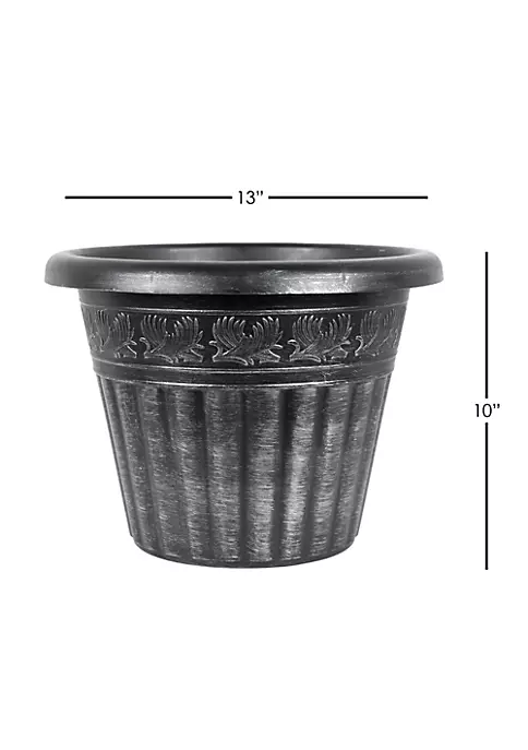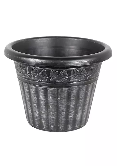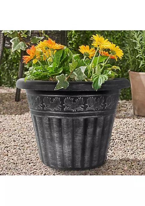 - Planter construction uses horizontal trim to join a gracefully curved planter shape with a proportionally sized rim. The simple design accentuates the plant foliage located within it.