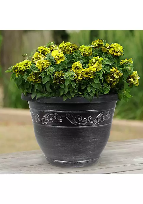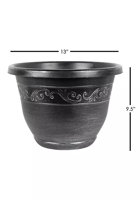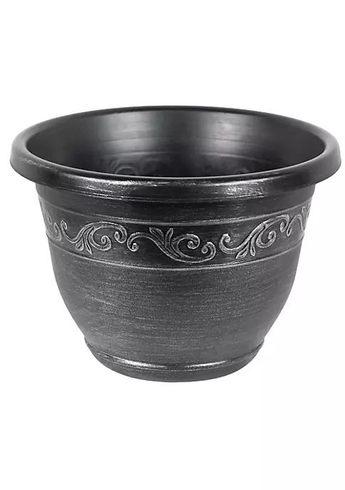 - Planter construction uses horizontal trim to join a gracefully curved planter shape with a proportionally sized rim. The simple design accentuates the plant foliage located within it.