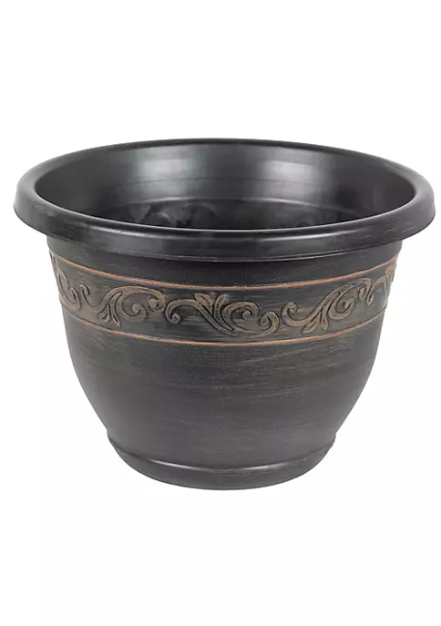 - Planter construction uses horizontal trim to join a gracefully curved planter shape with a proportionally sized rim. The simple design accentuates the plant foliage located within it.